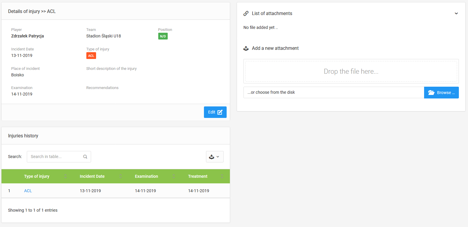 Κάθε τραυματισμός που έχει εισαχθεί έχει το δικό του ιστορικό, όπου καταγράφονται όλες οι λεπτομέρειες του συμβάντος. Εδώ θα μπορείτε να προσθέσετε ένα αρχείο με π.χ. εξιτήριο νοσοκομείου ή ακτινογραφία ως συνημμένο.